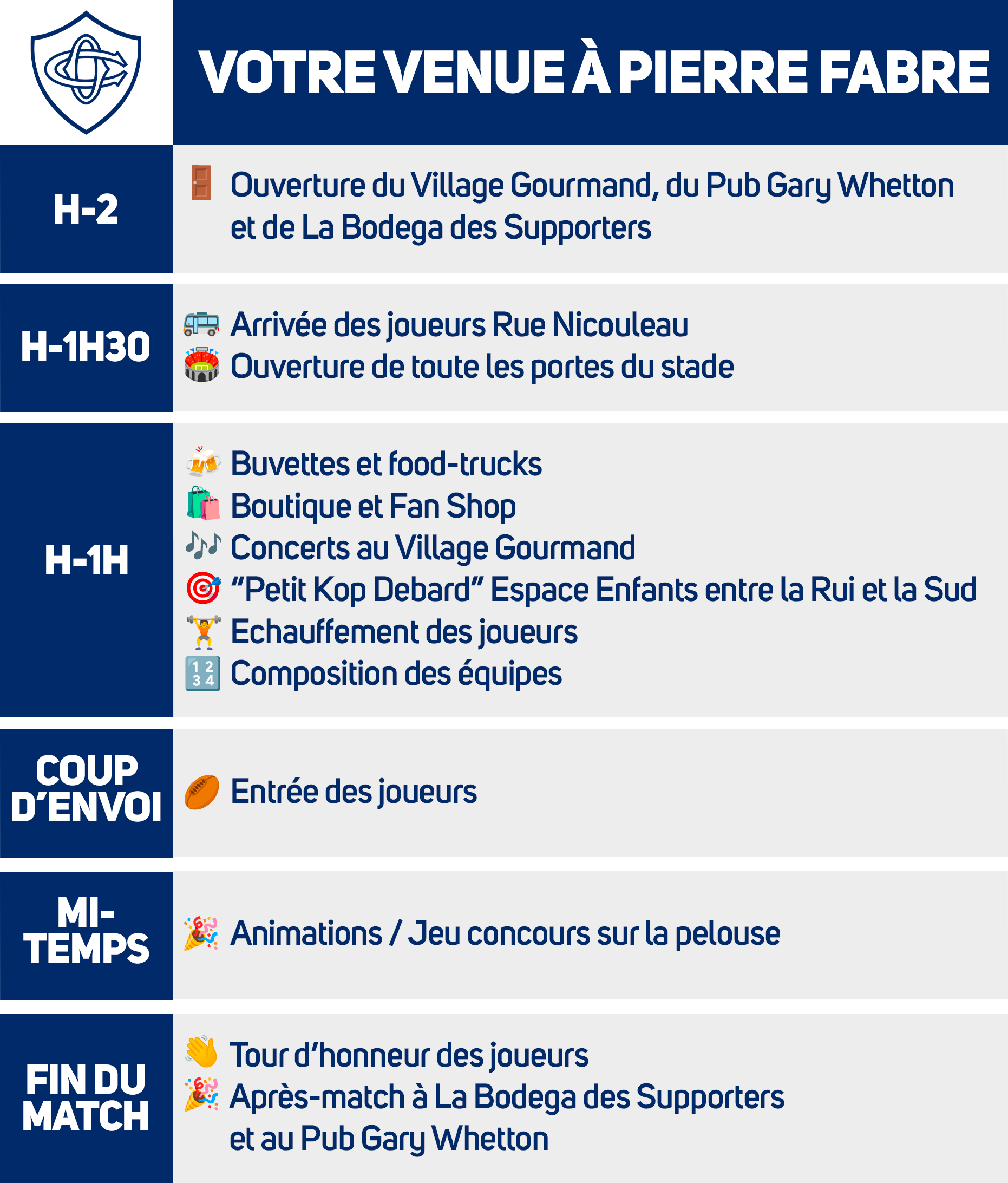 Pour toutes nos rencontres à domicile, nous vous accueillons dès 2H avant le coup d'envoi pour vivre votre expérience à Pierre Fabre !